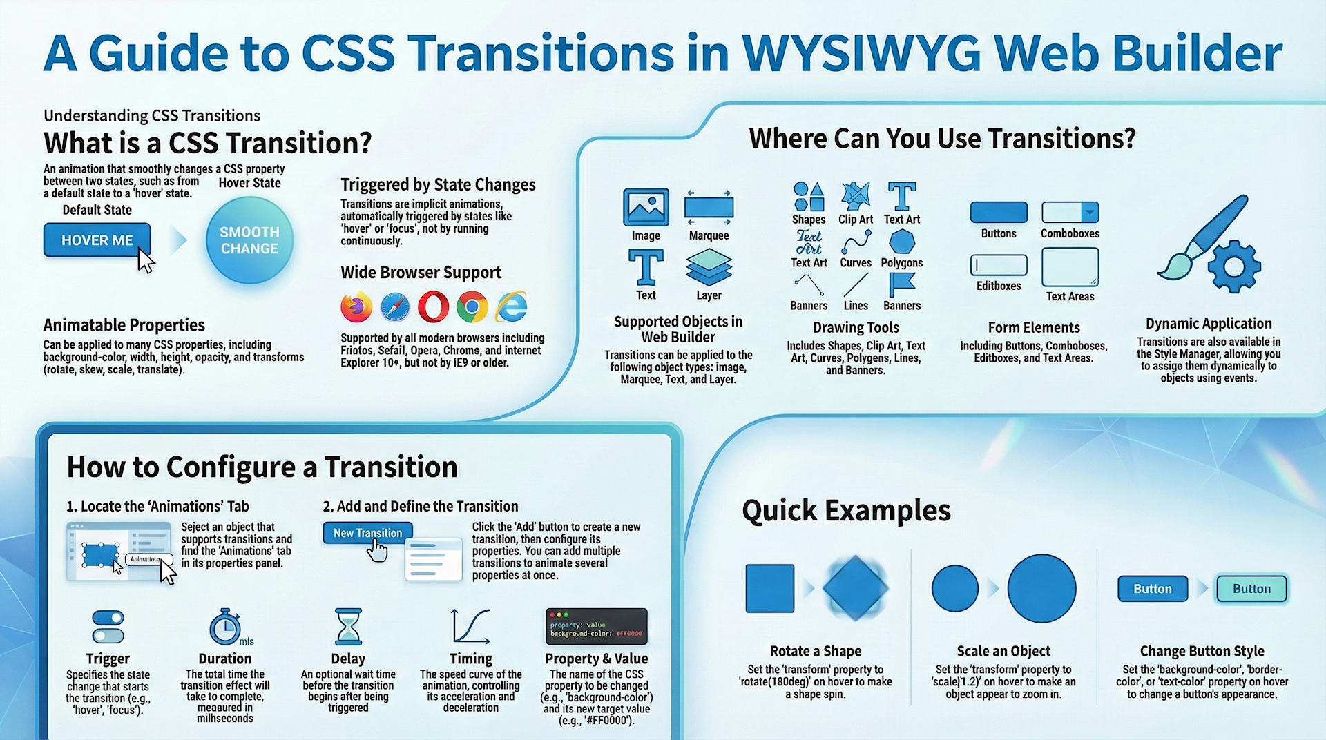 WYSIWYG Web Builder has built-in support for CSS3 transitions. Transitions are supported by all modern browsers. They will work in FireFox/Safari/Opera/Chrome/IE10 but not by Internet Explorer 9 or older.
